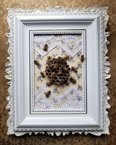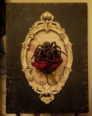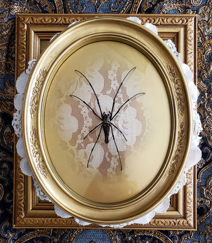 My art focuses on providing these phenomenal creatures with the tributary pedestals they deserve. Each specimen is stuffed and hand spread, placed in an elegant baroque/gothic setting. They are displayed proudly and with no glass, letting spectators come as close as their courage may allow. Every piece is one of a kind, often wearing regal motifs of lace, velvet, brass or whatever artist may unearth from her personal jewelry box; all layered upon vintage and customized frames. But the best thing of all in regards to these spiders is the metaphorical value that we can all relate with being unpopular, but it does not mean we cannot surround ourselves with luxury, it does not mean we cannot draw gasps of wonder with our uniqueness, and it does not mean that we cease to be magnificent. Won't you join me?